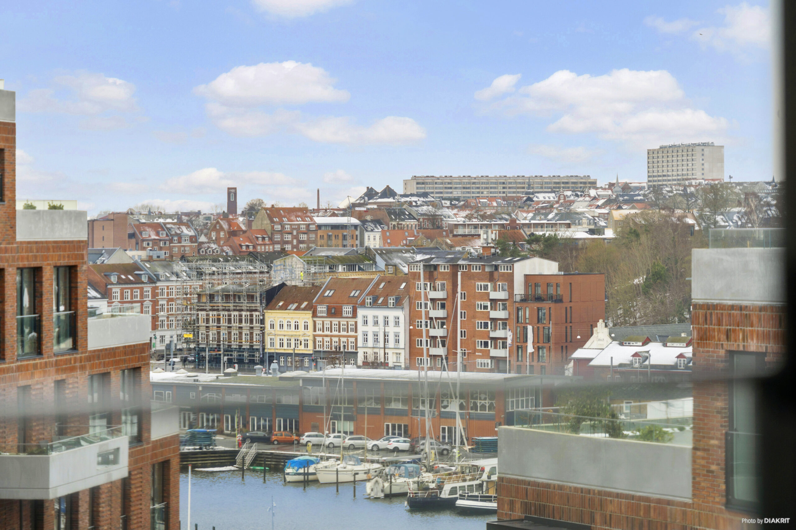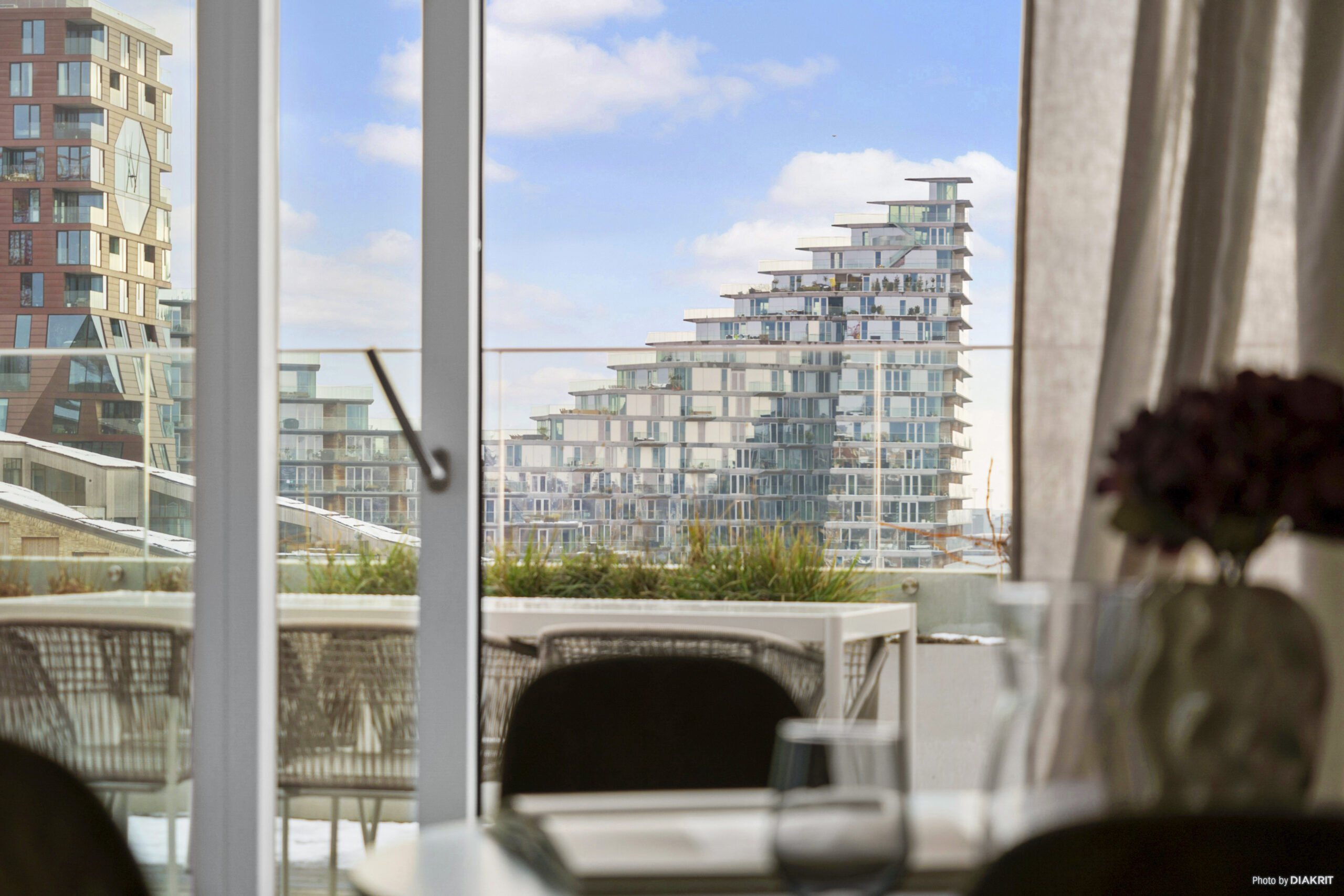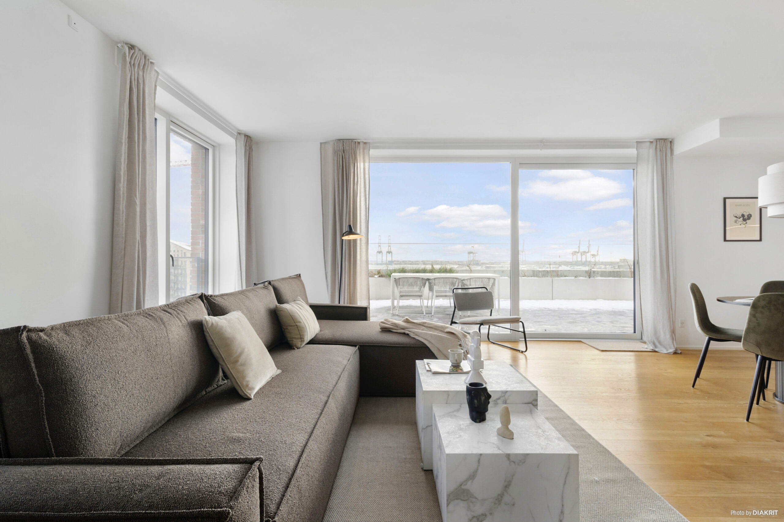 3 rooms, 125 m², with a 66 m² panoramic terrace overlooking the maritime life of Aarhus Ø.