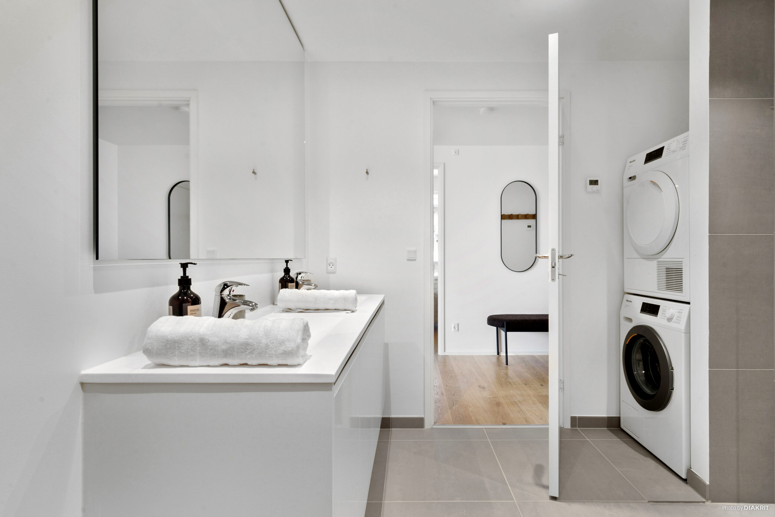 Lys entré med adgang til stort badeværelse med kvalitets hårde hvidevarer